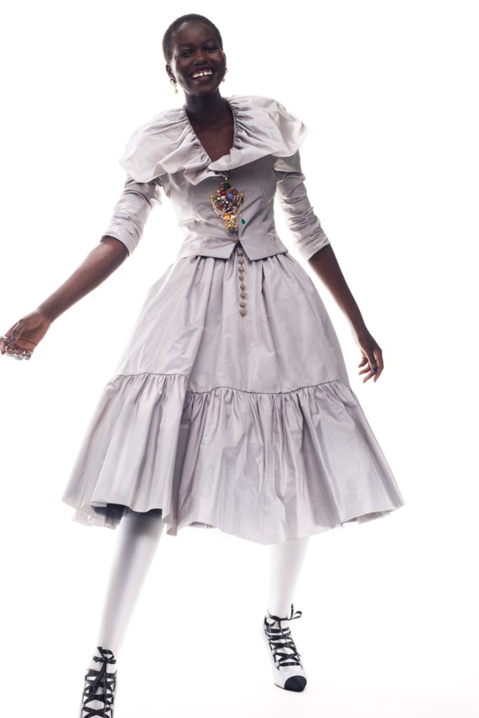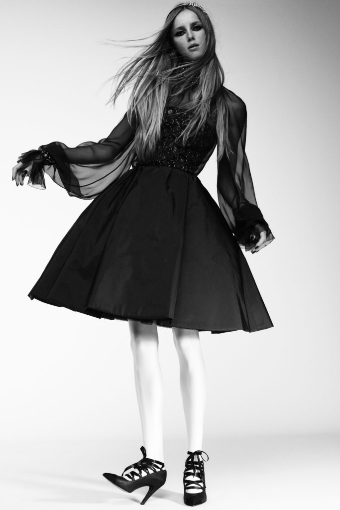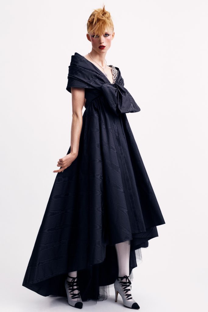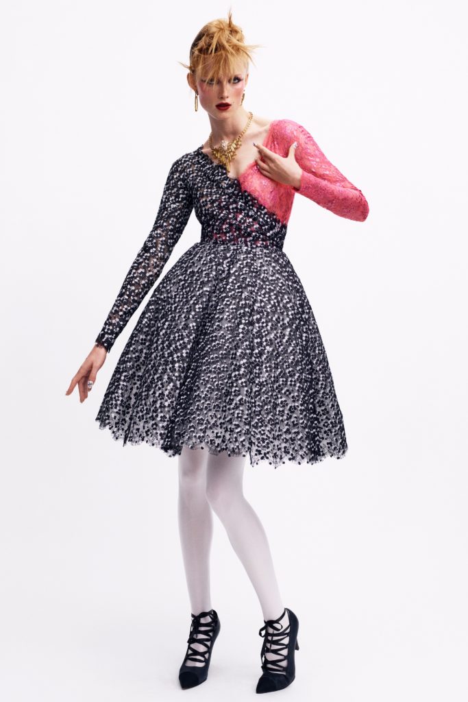 “I was thinking about a punk princess coming out of Le Palace at dawn. With a taffeta dress, big hair, feathers and lots of jewelry,” she wrote in the notes accompanying the 30-look lineup. “This collection is more inspired by Karl Lagerfeld than Gabrielle Chanel. Karl would go to Le Palace, he would accompany these very sophisticated and very dressed up women. Who were very eccentric too.”