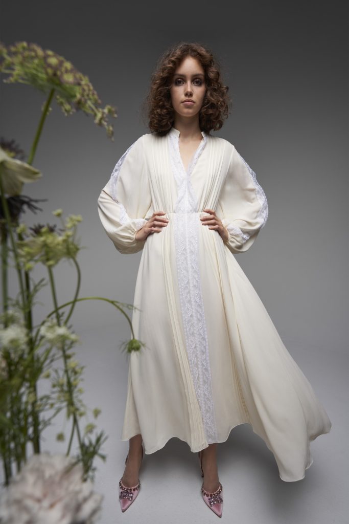 Valli sent clips from a video he made for the collection—fields of beautiful flowers bending gently, caressed by the breeze. “I love to keep memories from the gardens I’ve visited, like the terraced limonaie in Positano, or jardins sauvages, [which are] not too trimmed by human intervention,” he explained. “The most incredible one I have ever seen is the Suryagarh in Jaisalmer, which reminded me of a Mughal miniature, so exquisitely surprising as it grows in the middle of the Rajasthani desert in India.” The eye definitely has to travel, doesn’t it? “We have traveled extensively in our minds under lockdown. We’ve been apparently still, but so much has actually happened,” he said.