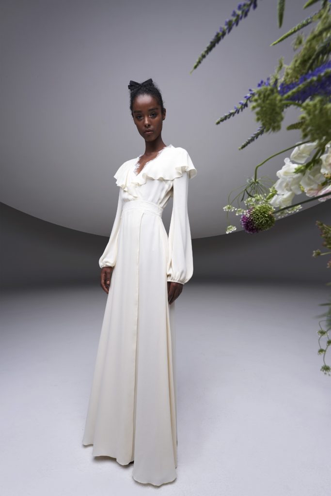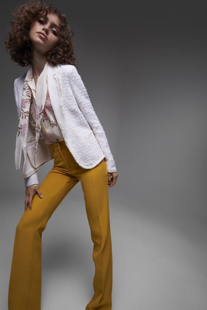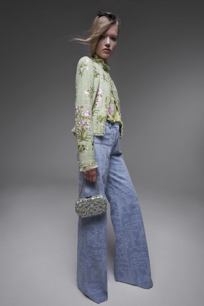 Like many of his fellow designers, Valli has reflected on his practice and on its future, emerging with a renewed focus and a vision more edited and clear. The languid occasion dresses he makes for his clients’ ’happy times’ were well represented here, but he also expanded his daywear options. Pragmatic while retaining his signature femme-fleur femininity, these included bell-bottom denims paired with small bouclé jackets, or billowy blouses worn with high-waisted pants.