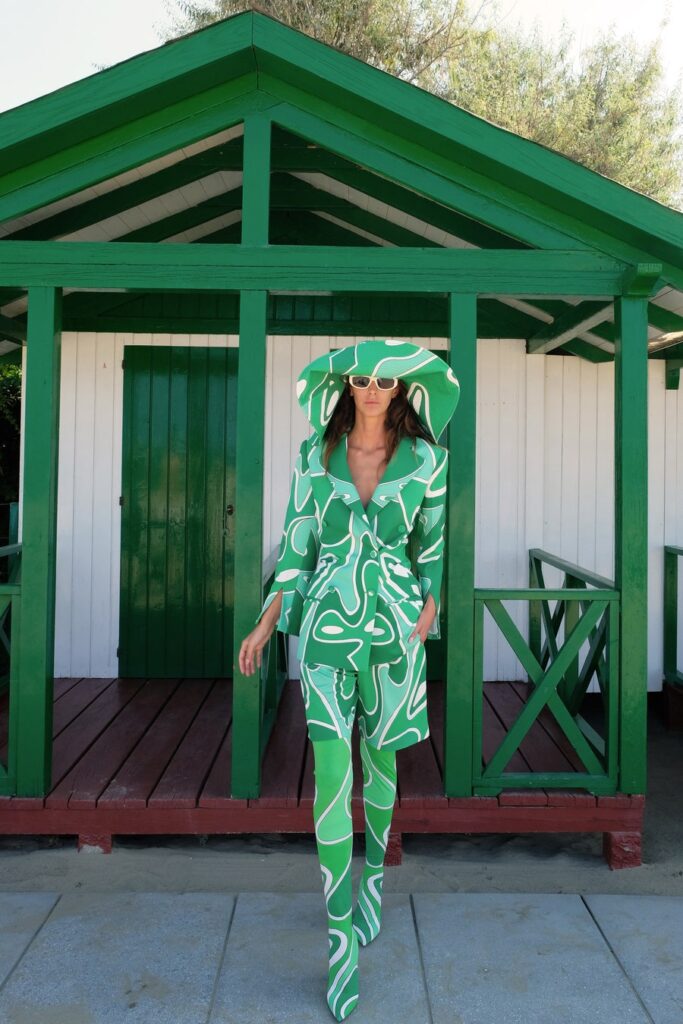 Battaglia’s style comes with an ingrained dose of flash—not even the strictest quarantine could tone it down. The allover Pucci-esque swirling print she designed for the collection (she called it “a dancing, smiling motif”) looked rather statement-making. Only a very self-confident post-lockdown creature, eager to resume flying the glamour banner, would have the nerve to negotiate a sandy beach wearing high-heels and a head-to-toe matching ensemble—a pair of skirt/shorts, an hourglass-y blazer, leggings, and a huge floppy hat, all curlicue-printed in a bright shade of emerald green. No question of going unnoticed wearing it—but after months of isolation, a little peacocking should actually do no harm, right?